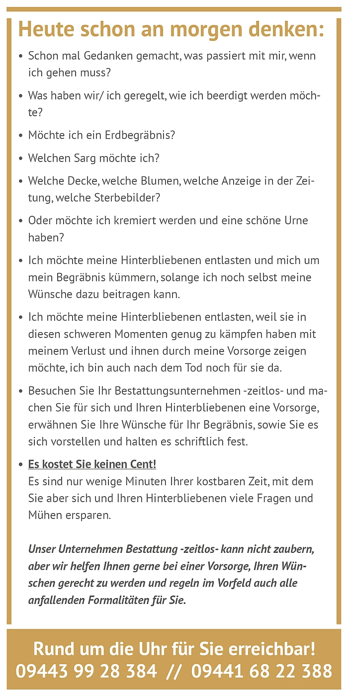 Für eine persönliche Beratung stehen wir gerne zur Verfügung und beraten Sie umfassend zu Trauervorsorge, Bestattungsvorsorge und Sterbegeldversicherung.